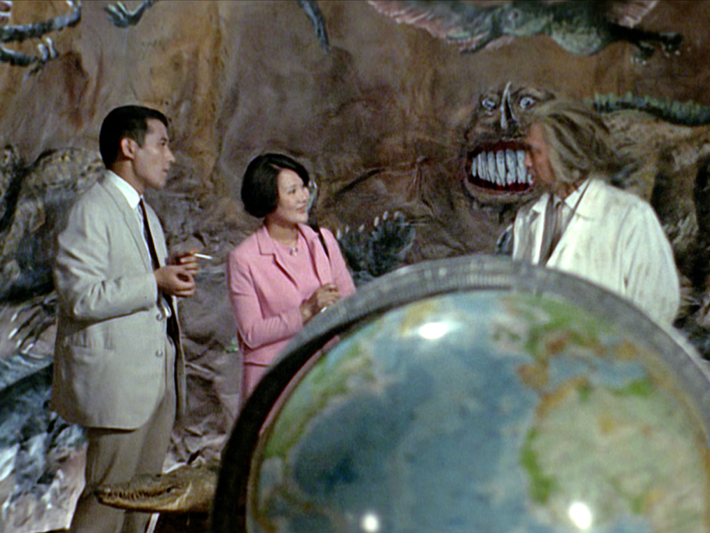Dr. Nakamura (Kanta Mori) is a kooky scientist who lives in an old mansion and works from an animal laboratory in the caverns beneath this home. It’s a classic horror movie set-up, mad-scientist wig and cackling crow included. The cavern walls are painted with murals of Dr. Nakamura’s obsession, dinosaurs. The cave laboratory is a fantastic set, and the dinosaur paintings have an archaic and mythic look that lends to the feeling that Dr. Nakamura is a dangerous madman.