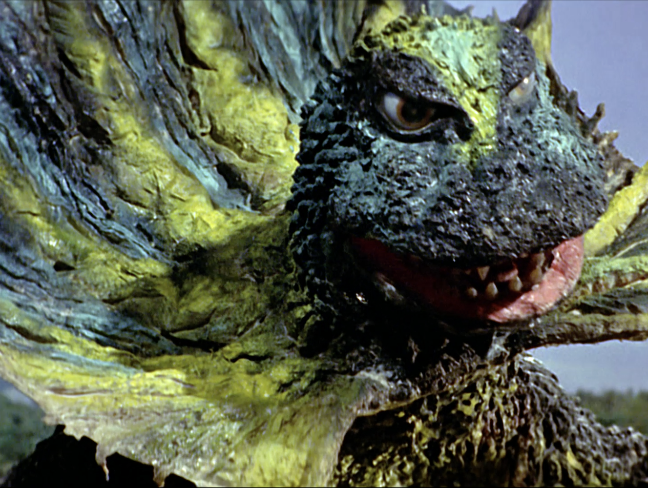 Jirahs is constructed from two Godzilla costumes: the 1964 outfit used in Mothra vs. Godzilla and Ghidorah, the Three-Headed Monster, plus the head from the 1965 costume for Invasion of Astro-Monster. The neck-frill hides where the two parts fit together. The green paint doesn’t do anything special for the costume except to suggest that Godzilla has gotten a bit moldy.