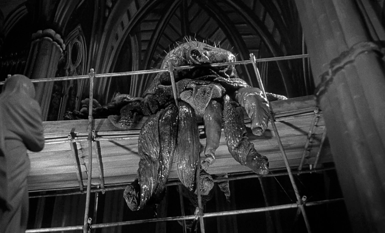 For the finale, the filmmakers made another major change to the TV serial. In the television version, Quatermass confronts the last stage of the alien mutation inside Westminster Abbey. He manages to reach the remaining shreds of Carroon’s mind and convinces the creature to destroy itself. The movie also ends in a confrontation in Westminster Abbey, but Brian Donlevy’s Quatermass isn’t going to sweet talk some monster. He’s going to blow it the hell up. Nigel Kneale was furious with this change to his ending — but, damn, it’s a banger. Val Guest knew what he was doing and delivered audiences the white-knuckle climax with pyrotechnics they deserved. James Bernard’s score is electrifying with its propulsive, frantic strings that push the tension over the top.