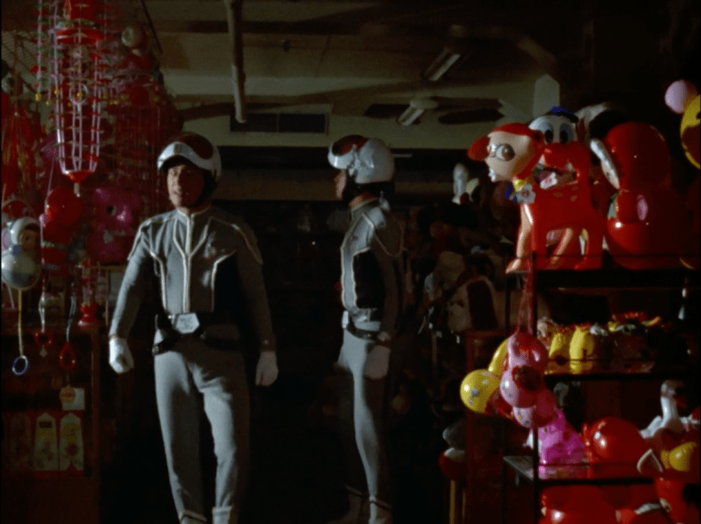 The climax is a fantastic spectacle considering it was shot on a slim budget with no VFX soundstage model work. Dan and Soga have to dodge Alien Chibull’s killer toy tanks, robots, and planes, as well as the laser-shooting android Zero One (Yukiko Kobayashi from Destroy All Monsters) inside a shadowy department store. This isn’t tokusatsu action; it’s crime drama action against a Batman supervillain, but it’s an exciting change of style. Dan eventually turns into Seven for a short wrap-up against Zero One and Chibull’s alien form, but the big climax already occurred.