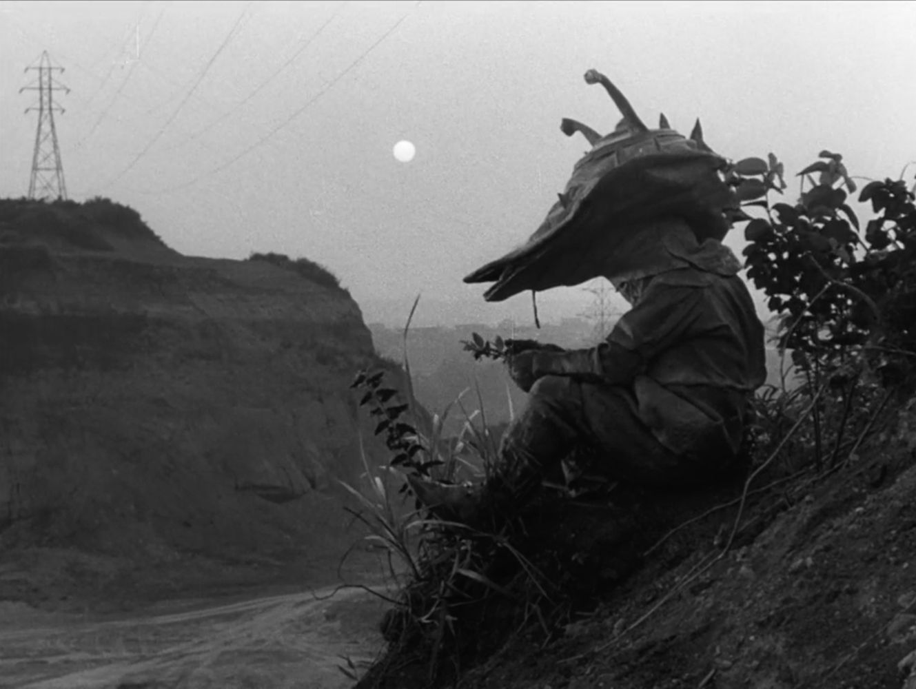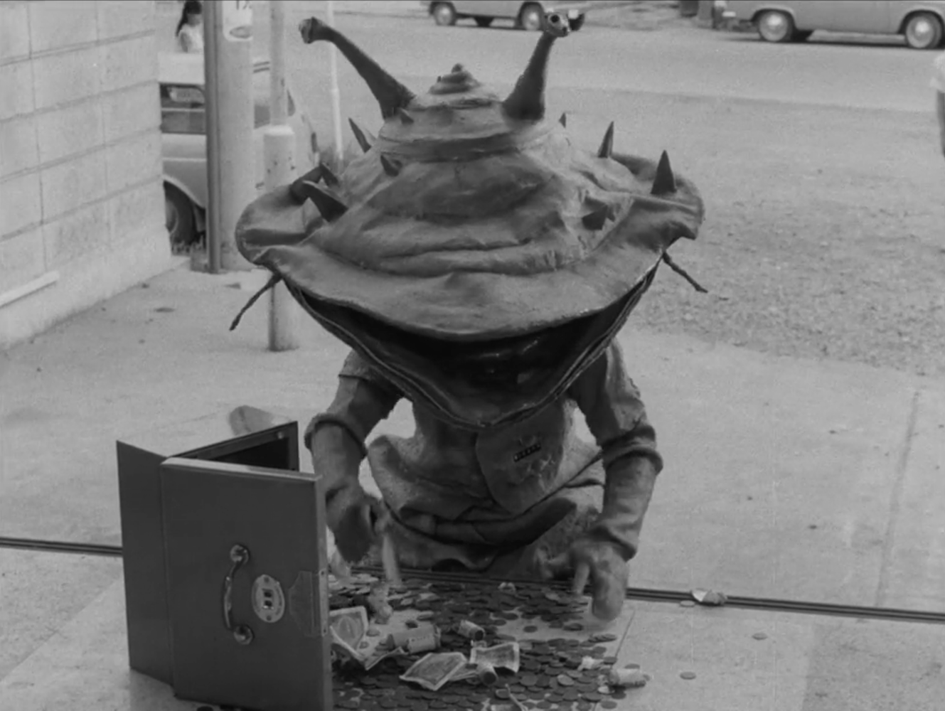 There are numerous scenes and shots that bring out the character of this strange-looking thing: Kanegon wandering the streets like a poor drifter; hungrily gobbling up coins from a dropped bank cash box; tumbling into a dirt pit while running away from maniacs on a bulldozer; perched alone on a hillside at sunset, moaning about hunger.