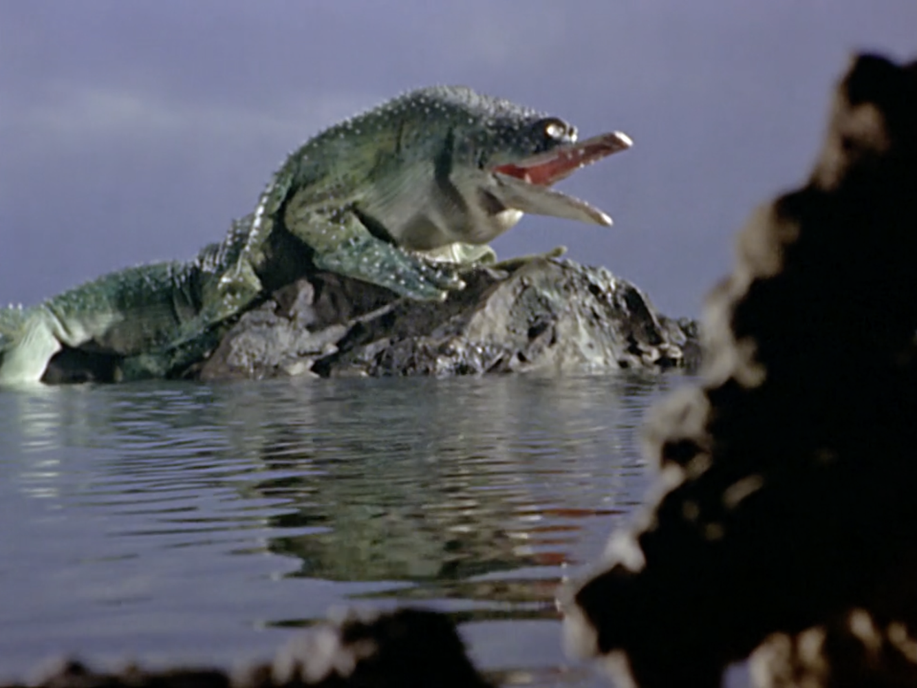 Gamakugira is an awkward and goofy-looking creature that lives up to its name, which is a portmanteau of the Japanese words for toad and whale. It slaps around clumsily on land and water and makes noises like a sick sea lion. Appropriately, this “Toad-Whale” gets a comical send-off when it faces Ultraman. (Ultraman, however, has never looked better. This episode debuts the Type-B mask, an improvement over the lumpy first Type-A mask.)