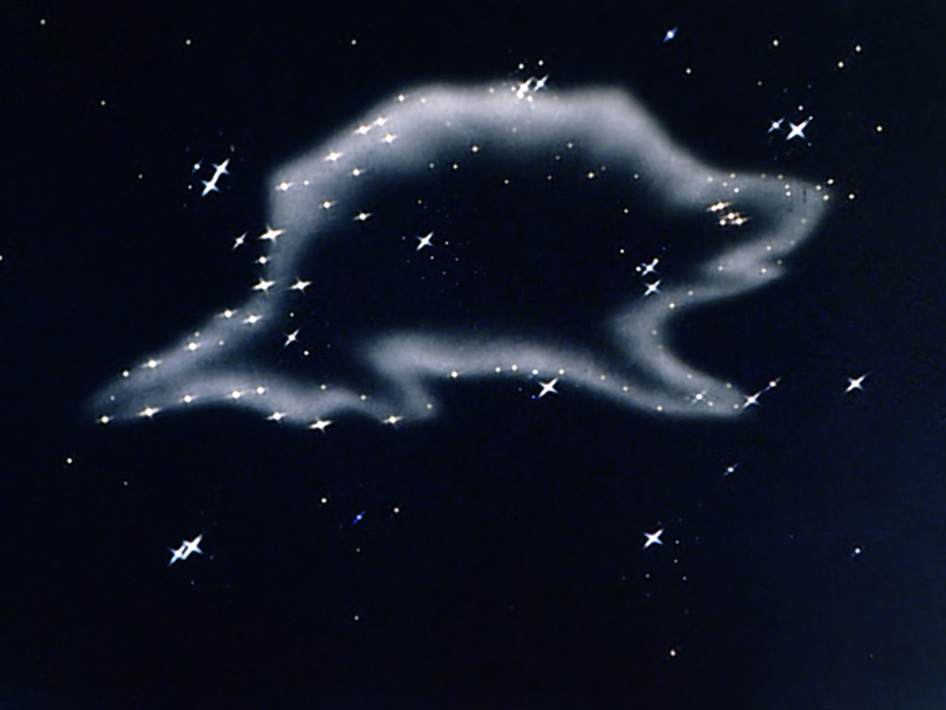 In the 1960s, fuzzily defined “cosmic rays” were frequently used in science fiction as story catalysts, similar to how atomic radiation in the ‘50s was the magic method to create monsters or mutants. The magic of cosmic rays this time transforms a two-dimensional drawing into a three-dimensional object. In other words, a child’s chalk picture drawn on a clay pipe in an industrial yard manifests as a giant monster.