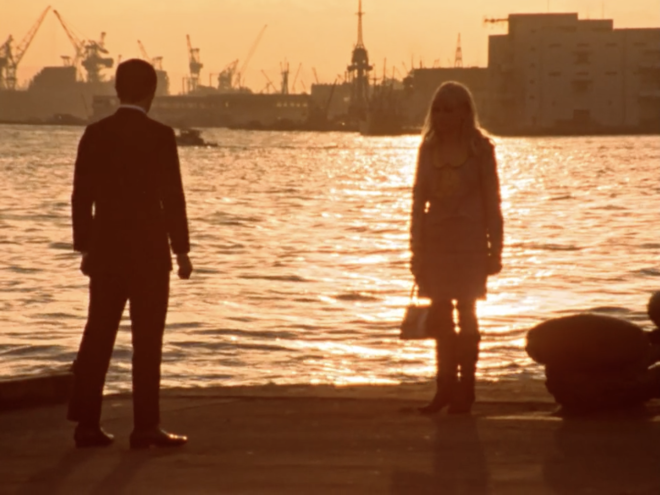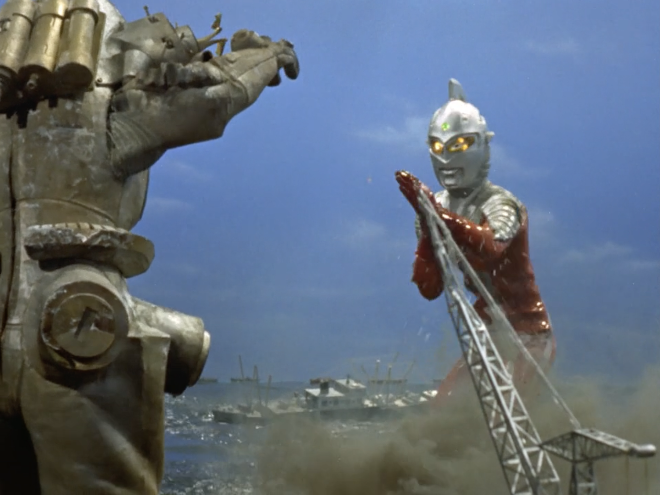 Just on the level of effects and spectacle, “The Ultra Guard Goes West” is some of Tsuburaya Pro’s best work on television so far. There are two fights between Seven and King Joe, and not only are they lengthy battles packed with pyrotechnics and fantastic choreography, they take place in dazzling visual settings: first the Kyoto International Conference Center (standing in for the Special Defense Headquarters), and then among the ships at the Kobe docks, where King Joe can pick up a cargo ship and swing it like a truncheon. The Ultra Guard gets to go into action with Ultra Hawk 1 and their underwater attack vessel, the Hydranger. The kids who did tune in must’ve loved it.