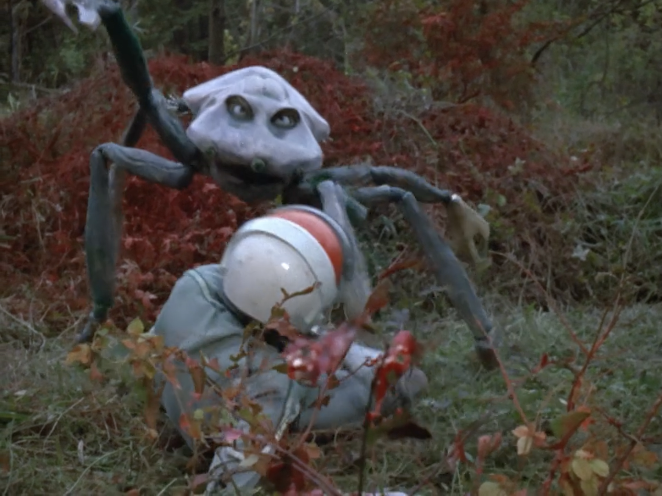 Even with their fairly meager resources, the production team manages to inject a lot of otherworldliness into the location photography of this alien forest. Hazy images, fog, tree branches painted red, weird music, and especially the monsters. The vampire vines from “The Monster Anarchy Zone” are back, and there are also super-ticks and a crab-legged spider creature that shoots out poison gas. The only giant monster is Alien Bell, who never speaks or appears in a smaller form.