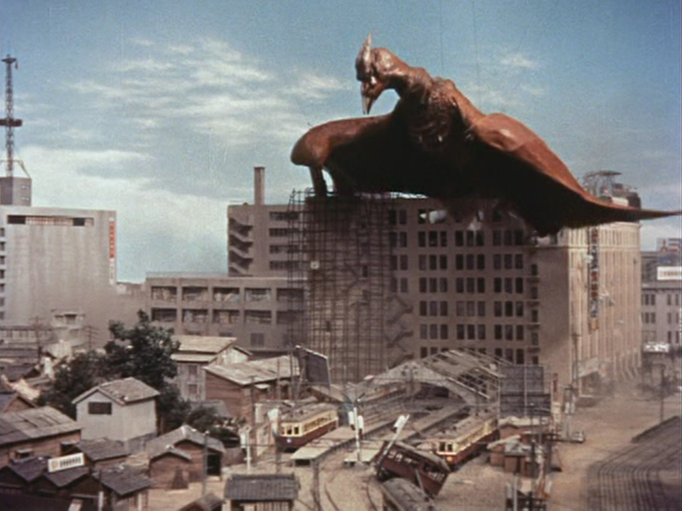 The fast, kinetic mayhem in Kyushu is a stylistic change from the famous Tokyo rampage in Godzilla, which Tsuburaya orchestrated as slow-building doom. Here, Tsuburaya and his team fill the sky with smoke and debris, shred shingles off roofs, and hurl vehicles through the air to demolish buildings. The enormous amount of time, money, and effort required for the details put on screen is mind-boggling. The footage was so impressive that it ended up recycled in numerous later Toho films as well as the Ultra Series. (A good portion of the finale of “I Saw a Bird” comes from Rodan.)