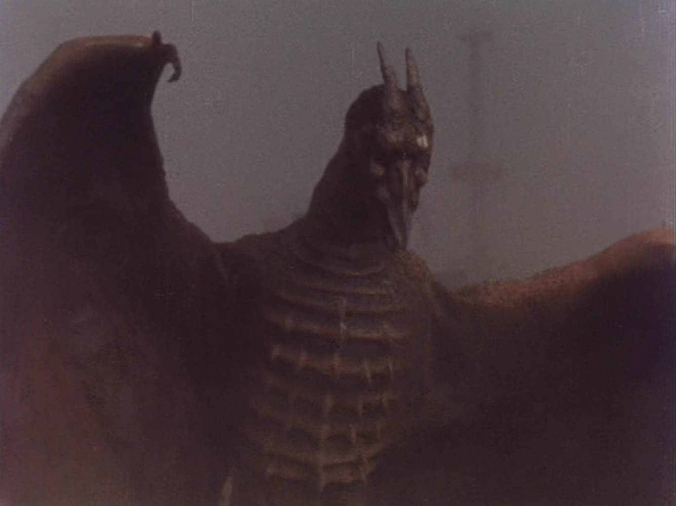 A visual shock causes Shigeru to recover and recall the trauma that paralyzed him. Deep in the caverns of the volcano, he saw a winged reptilian creature hatch from a giant egg and feast on the Meganurons. The flashback of the hatching of the title monster is grotesque with a touch of Lovecraftian nightmare. The score from Akira Ifukube is especially effective here, heavy and hallucinogenic.