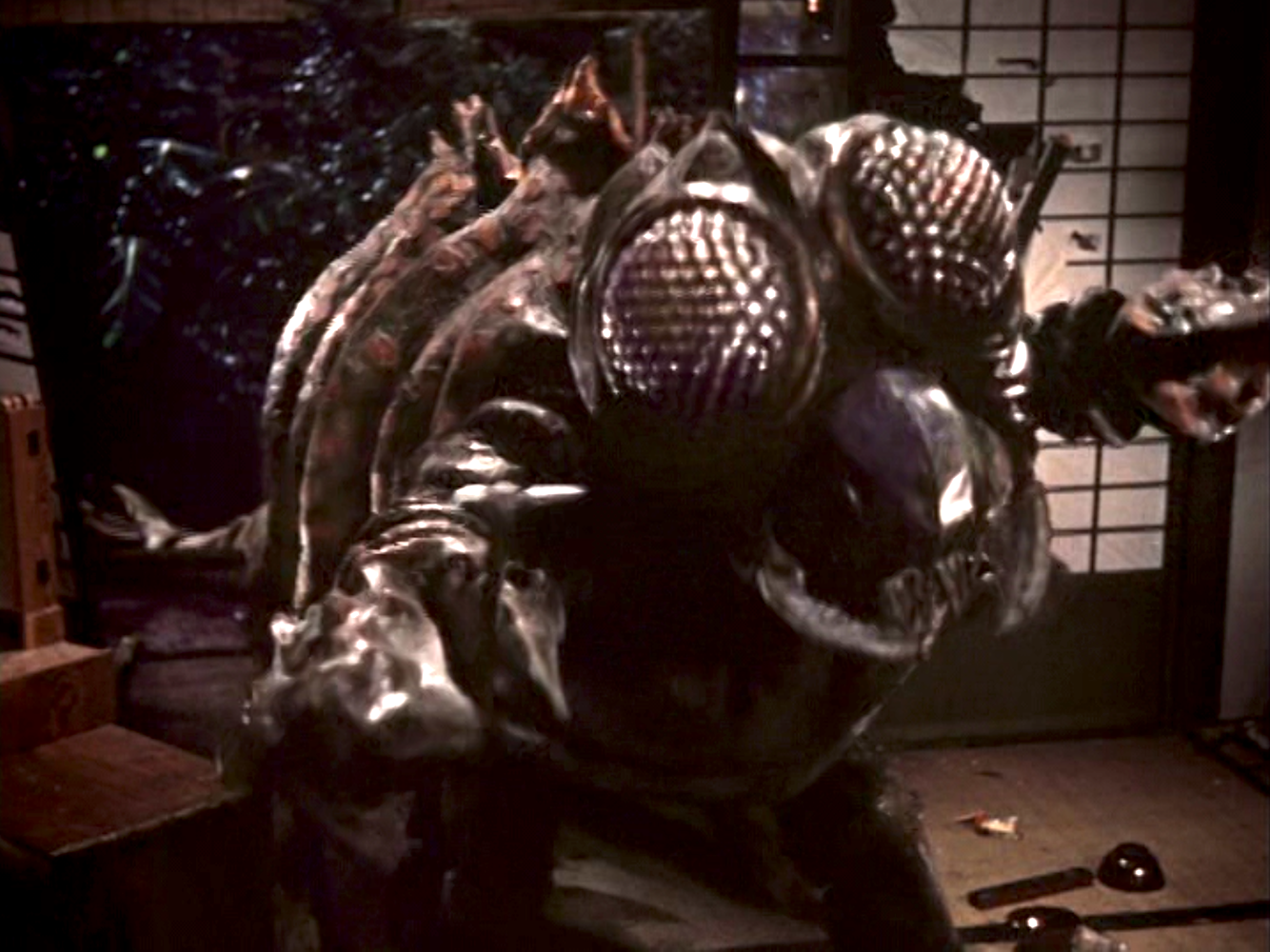 The real killers are Meganurons, the giant larvae of prehistoric dragonfly creatures. The Meganurons have burrowed up from the lower tunnels after their dormant eggs hatched. The scenes with these caterpillar-like creatures are legitimately effective as horror pitched on a human-scale, which makes for a good opening to a movie that will eventually broaden to a massive scope. Watching screaming miners get dragged beneath the water by an unseen attacker is unnerving, and the scene of the police trying to kill the creatures in claustrophobic tunnels has some of Honda’s best suspense direction. These sequences were likely inspired by the finale of Them! (1954), the classic “big bug” film of the ‘50s, where the military tries to wipe out a nest of giant ants in the Los Angeles storm drains.