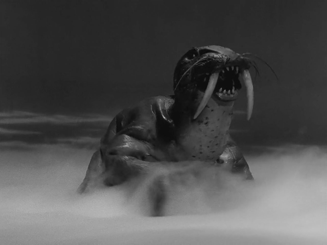 The tale of Flight 206 makes for one of the most exciting and fast-paced episodes of Ultra Q. The crew and passengers of the lost plane end up in a cloudy realm filled with the remains of World War II fighters, a sort of aerial Sargasso Sea dimension, and the tension and danger are almost constant. Not only do Jun, Ippei, and everyone else on the plane have to figure out what happened and how they can escape, but they also must deal with a criminal trying to take over the plane. Notorious murderer Taro Orion (Ishiro Honda regular Nadao Kirino, who has the gruff, gun-wielding gangster look nailed) breaks free from his police escort and holds the plane hostage with the officer’s gun. As if things weren’t bad enough, there’s a giant walrus wandering around the clouds…