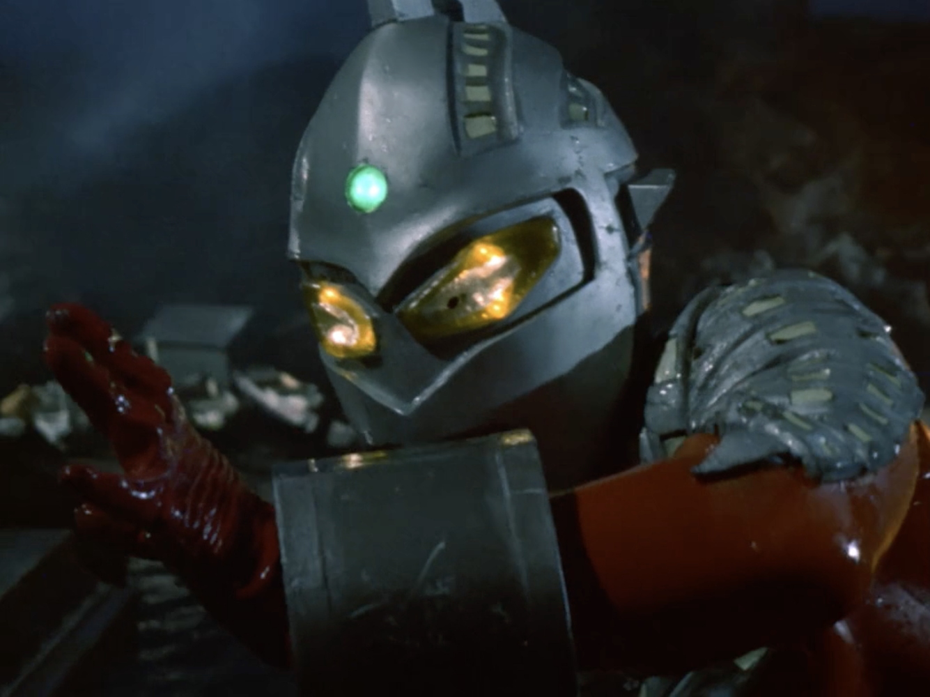 Along with its interesting design, Iron Rocks gives the episode a different way to approach the visual effects set pieces. It’s essentially a mobile super-weapon, and when Seven has to face it during the finale, our hero can’t jump to his usual methods of giant monster tussling. Earlier action sequences where Iron Rocks’ guns start shelling a town have the feeling of a war movie, a genre that Eiji Tsuburaya knew extremely well.