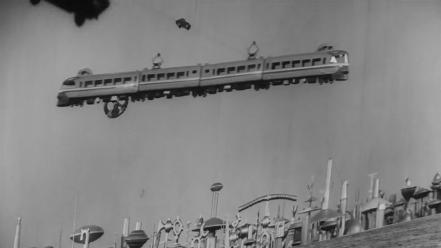 The last episode shot for Ultra Q defies easy explanation and concludes in the most bizarre and inexplicable way possible for an already bizarre and inexplicable show. A recently grown organic life form that looks like a gravity-squished gorilla accidentally hijacks a high-speed train on its first run while a stowaway newspaper boy is aboard … and it keeps getting stranger and stranger. It’s played for big laughs but still has enough science-fiction material about emergent technology to hold the crazy-quilt thing together all the way to the jaw-dropping WTF!?! closing. The confidence in tone on display here predicts the colorful franchise to come. I am seagull, I am seagull…