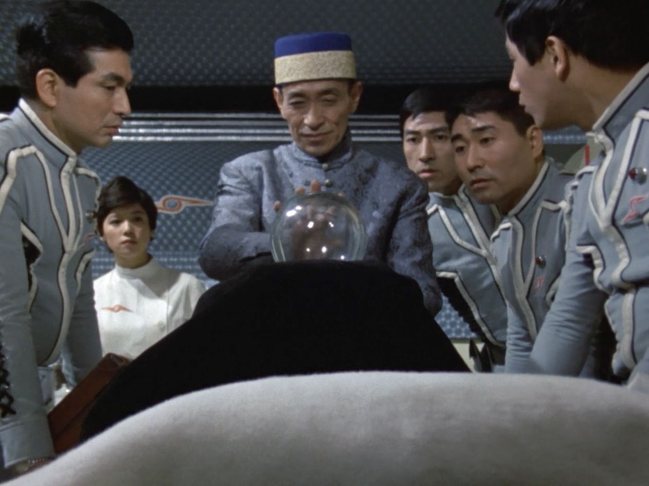 You might not guess that this is one of the more subtle Ultraseven episodes based on its opening shots: a desperate man shrieking for help as he flees from a jeep trying to pulverize him. The intended victim is Yotaro Yasui (Tadashi Okabe), a self-proclaimed psychic. After the Ultra Guard rescues him from the black-garbed jeep driver, Yasui tells them his crystal ball has predicted an imminent explosion at a warehouse that serves as the TDF’s Super Weapon Development base.
