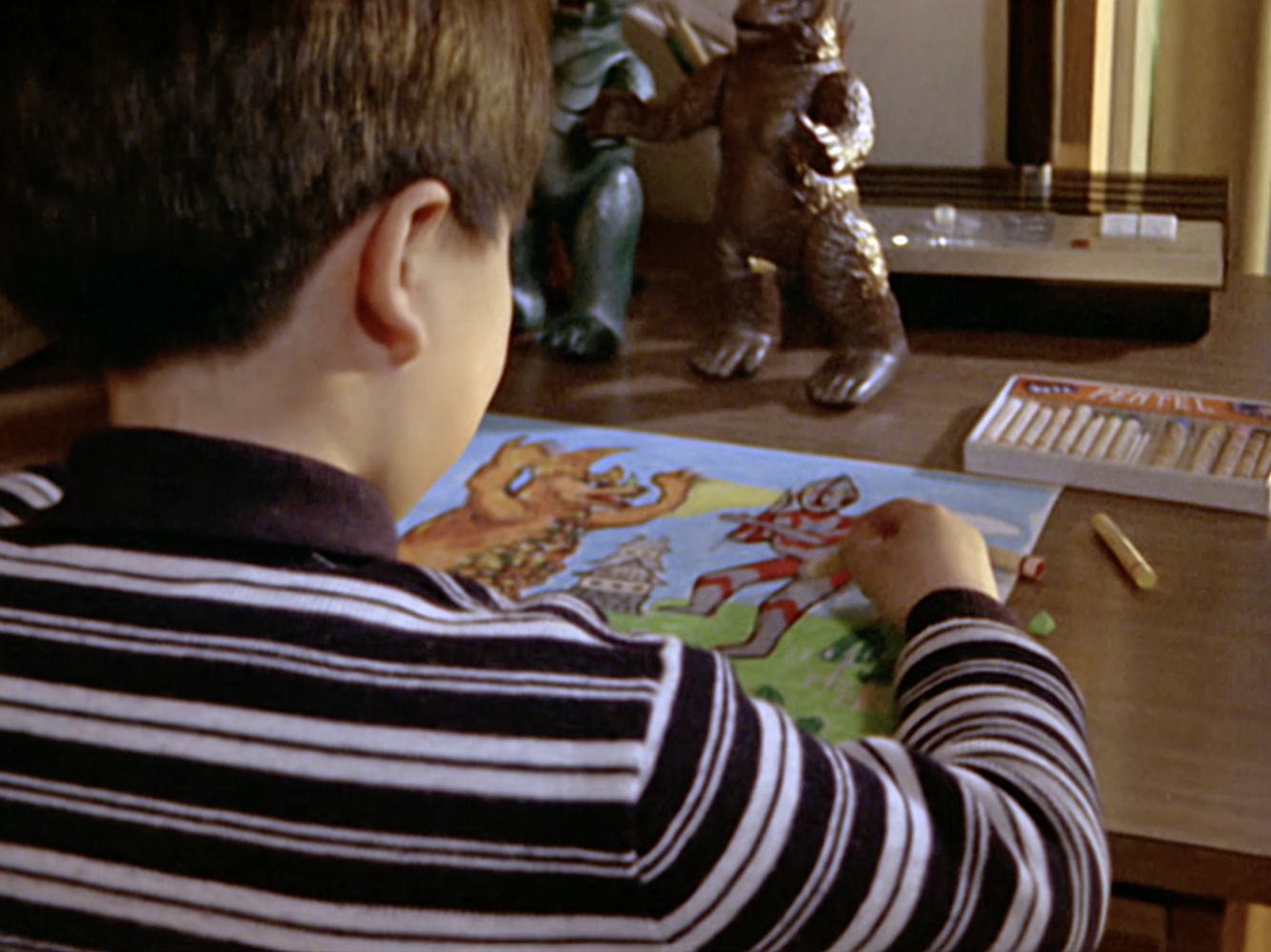 Young Osamu Suzuki (played by Chiharu Inayoshi, who returned in Ultraseven’s “The Eye That Shines in the Darkness”) is a fan of monsters, specifically the ones seen in the show. His fandom, however, has caused problems. His mother thinks his monster drawings are distracting his attention from his school subjects, and other kids tease him for believing monsters exist.