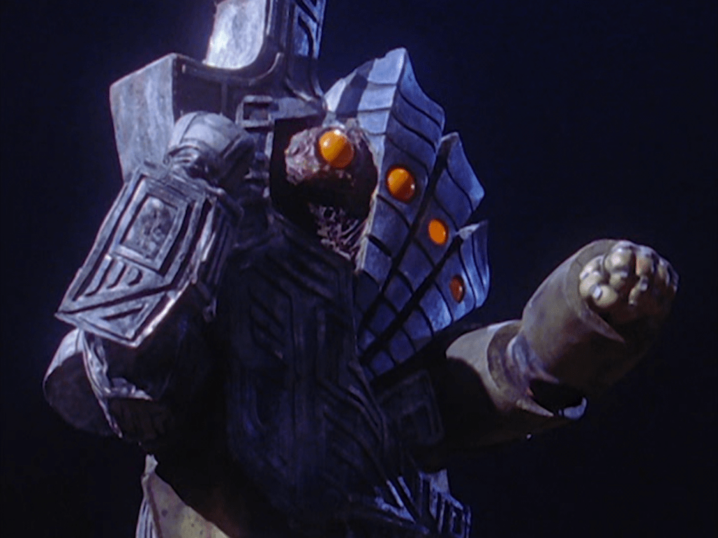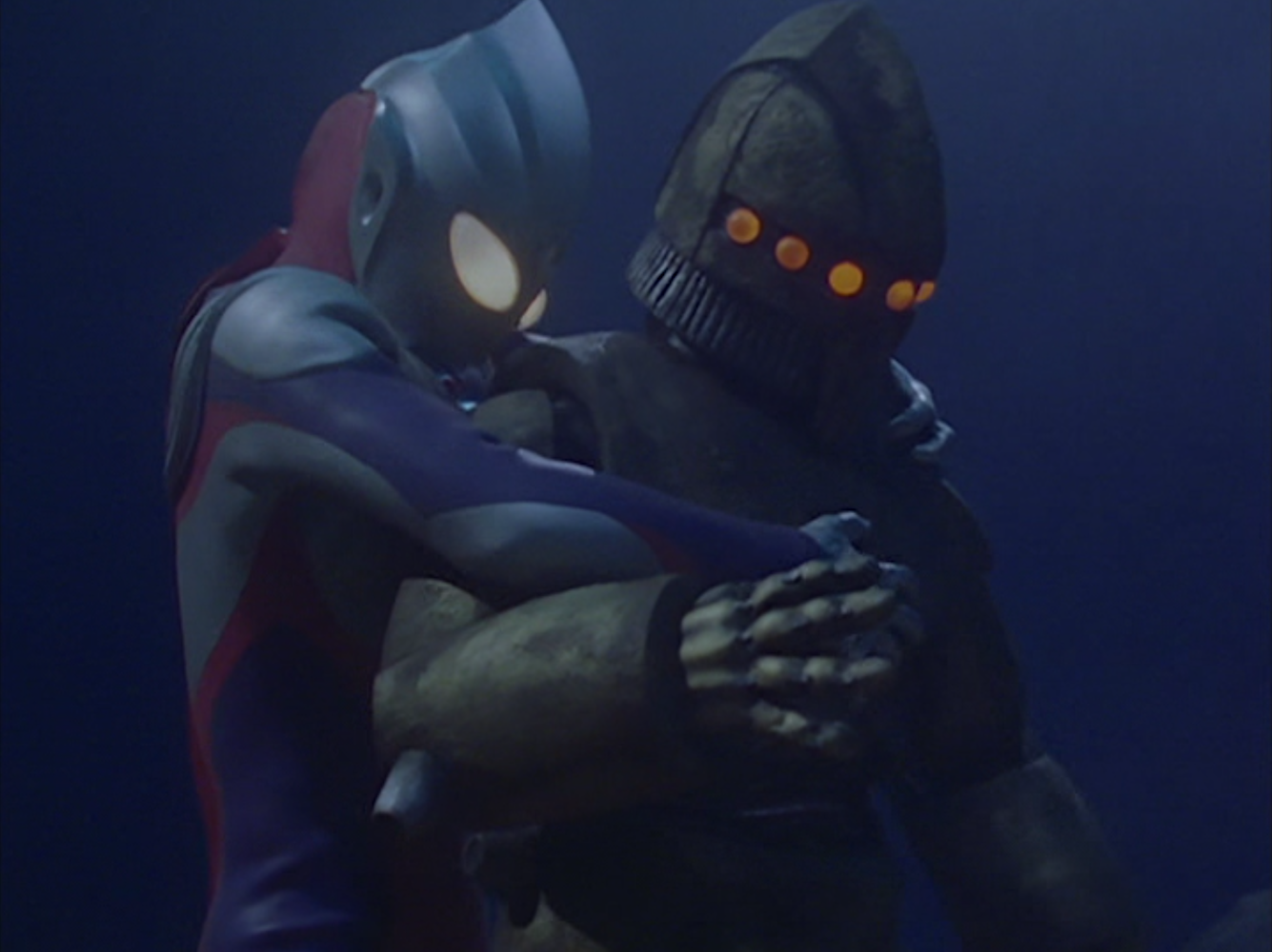 The Gobnu are powerful opponents, both as a horde of human-sized robots and as two different metallic giants (Gobnu Giga and Gobnu Ogma) that both come close to defeating Tiga. What makes the Gobnu most interesting is their background: they’re an alien-built security system programmed to “take action whenever a forbidden power is about to be used,” i.e., any technology of other civilizations that the creators of the Gobnu deem a threat. The robots don’t know who created them and don’t have the ability to care. It’s a very Star Trek concept: an amoral weapon executing the violent ultimatum of its creators in perpetuity. I suspect the Gobnu’s masters went extinct centuries ago, like the builders of the titular device from the classic Trek episode “The Doomsday Machine.”