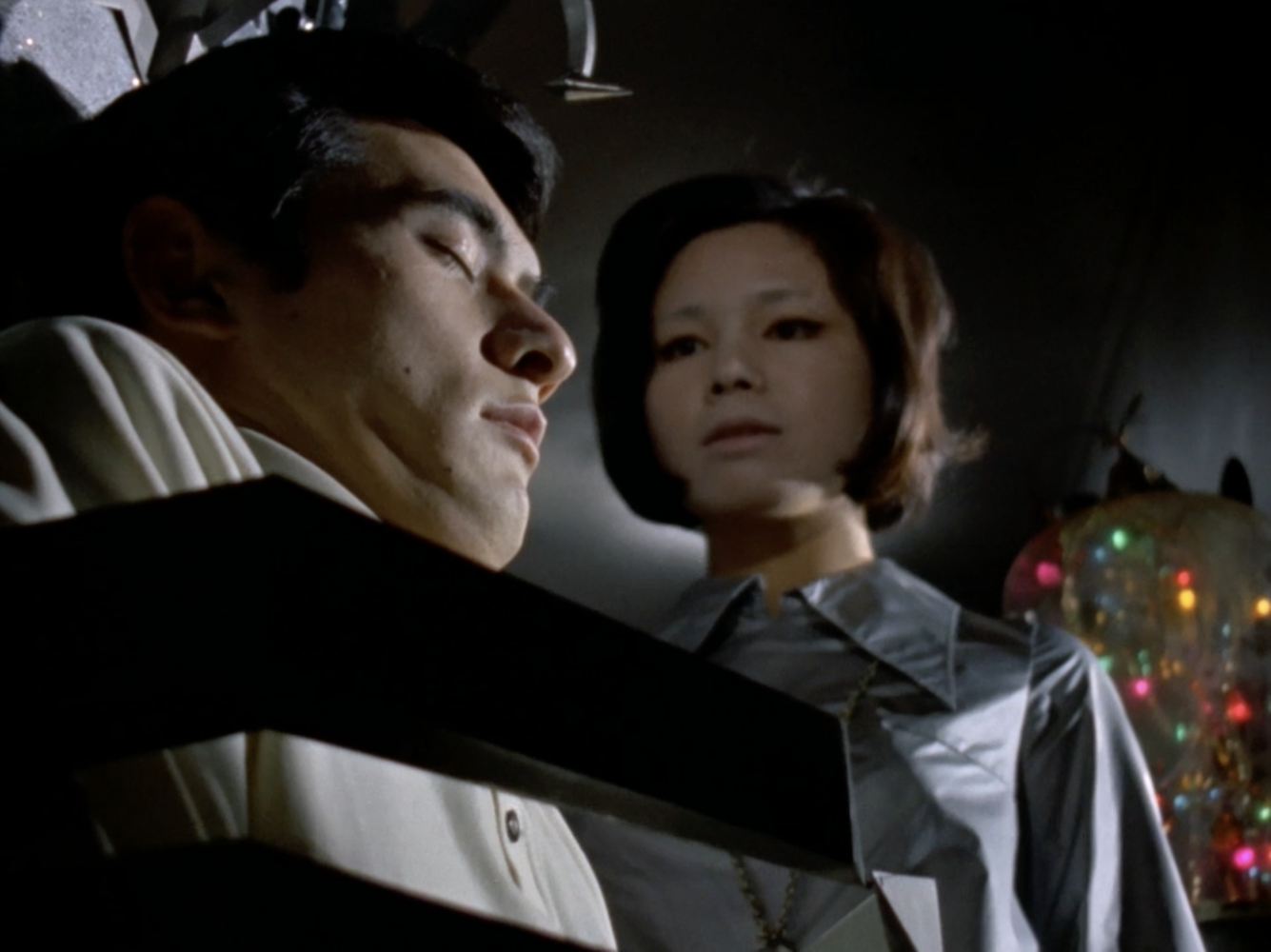 Director Suzuki was clearly attempting a visual style similar to Akio Jissoji’s — an approach that becomes more common in the Ultra Series from this point. Many of the sets are shrouded in darkness, characters are pushed to the edges of the frame, and several shots use heavy diffusion. The interior set of Alien Borg’s ship is unimpressive, but the moody lighting helps to disguise it and add some appropriate weirdness.