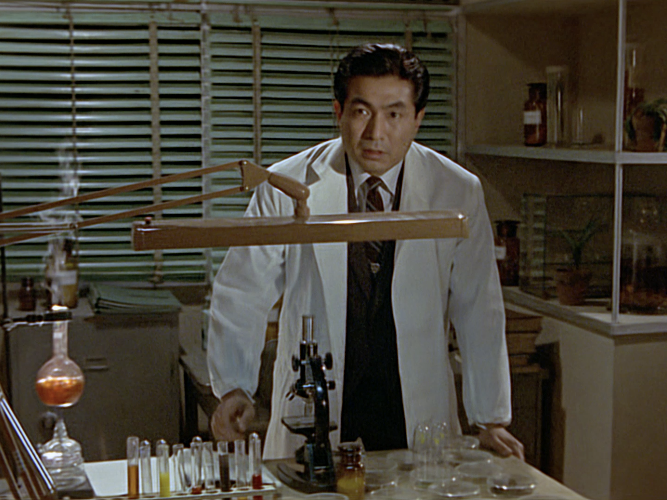 The guest cast contains two familiar faces: Nadao Kirino (Goto) appeared in two Ultra Q episodes (“Goro and Goro,” “The Disappearance of Flight 206”) and played supporting roles in numerous Ishiro Honda films. Shoji Nakayama (Dr. Ninomiya) would go on to play series regular Captain Kiriyama in Ultraseven thanks to the strength of his performance here.