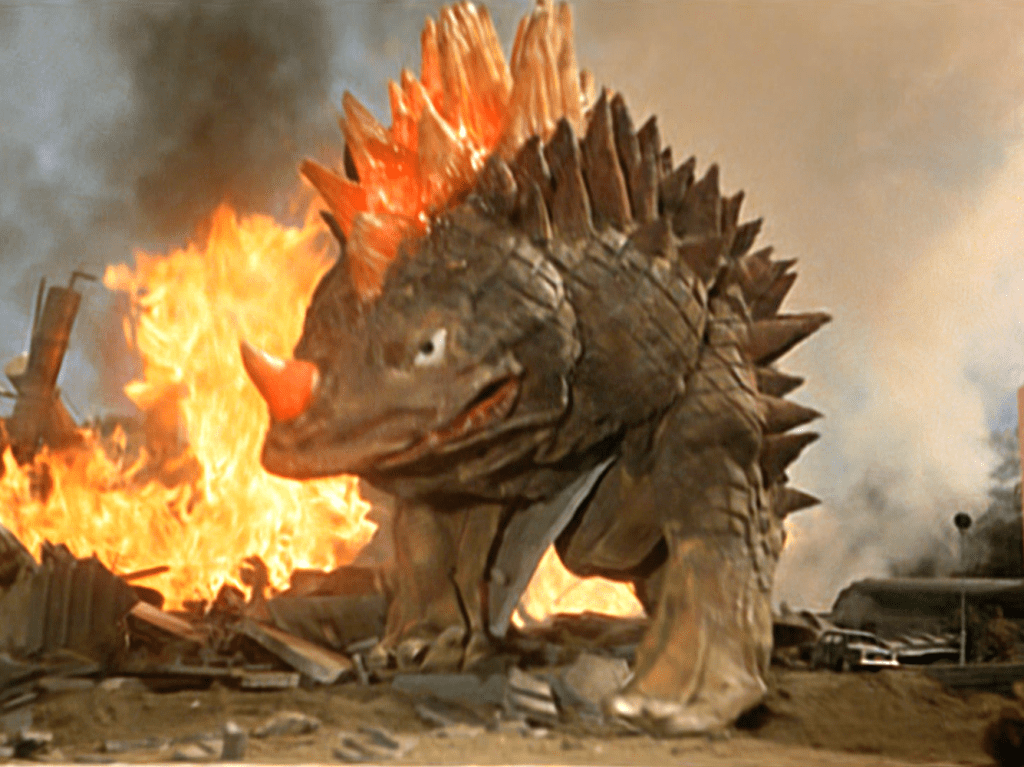 “Endless Counterattack” shows how much the Tsuburaya Pro special effects team evolved since the earliest episodes. The VFX crew has had 31 episodes of training, and at this point they can throw a massive pyrotechnics party in their sleep. They take the “endless” part of the title seriously, because the assault on Zumbolar with tanks and the Jet VTOL feels nonstop. And it’s not boring. Zumbolar is also an effective kaiju, a classic quadruped dino-form with a bit of flair.