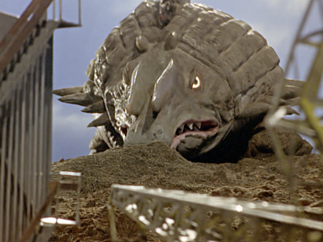 The next thing to fall from the sky is the problem kaiju: Skydon, a large quadruped that resembles an Ankylosaurus. Skydon is slow-moving and spends most of its time sleeping, creating sporadic danger. More of an annoyance. After a conventional scene where the SSSP discovers that their weapons can’t harm Skydon, they decide they must lift the monster off into space. Now — how to do that?