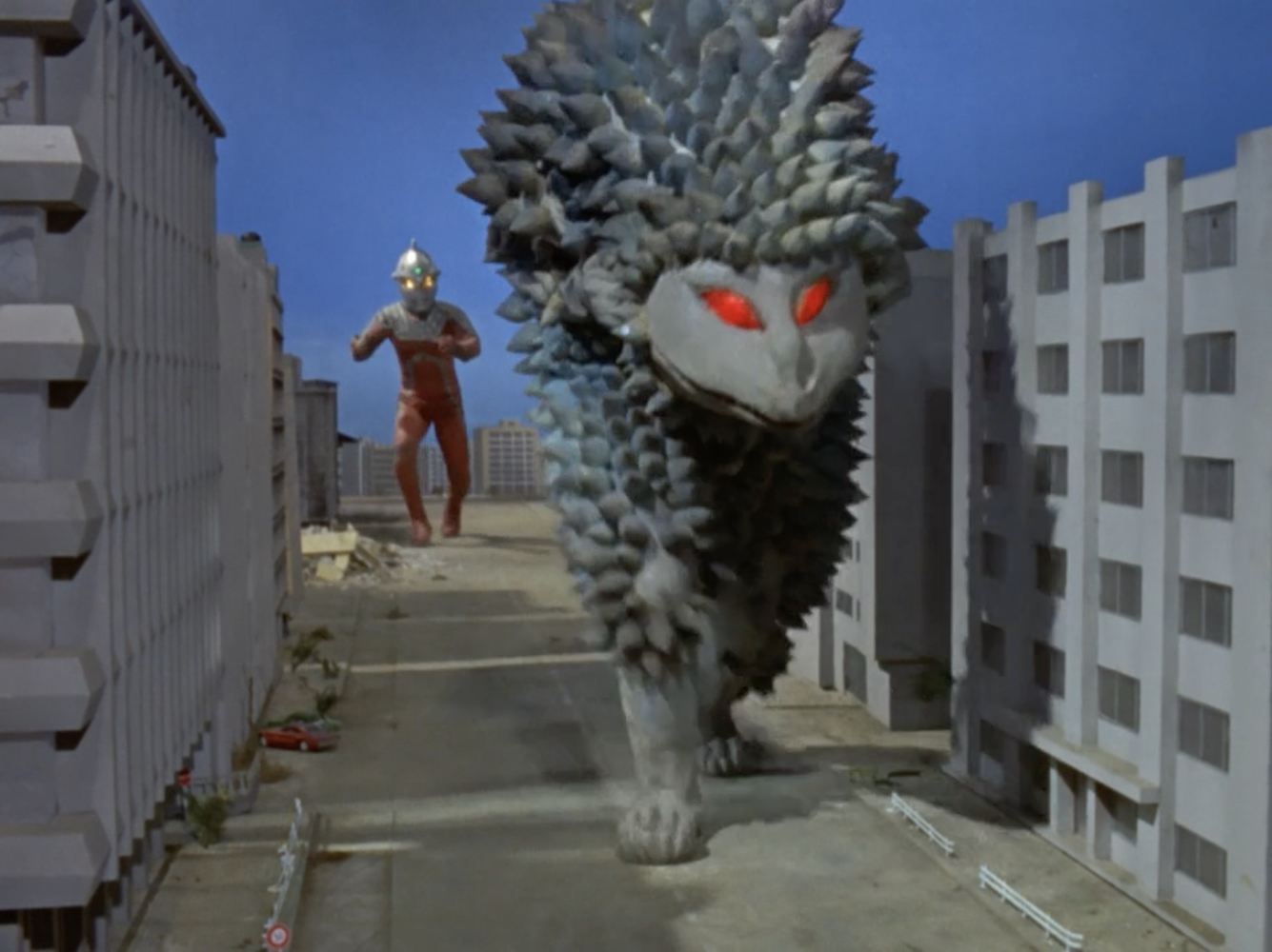 The climax of Ultraseven vs. Dancan — a spiky hedgehog beast — is outrageous in the best way. The buildup, with the alien-controlled Seven wrecking buildings, escalates the danger; the switch to the fight with Dancan comes as a welcome catharsis to close out the action. Dancan rolling up into a ball and bouncing around the canyons of the stolen city blocks is the kind of beautiful ridiculousness I live for in these shows. The episode earns this kind of finale and stops short of letting it go too long. There’s still just enough of a serious tone, especially in the music, to hold everything together.