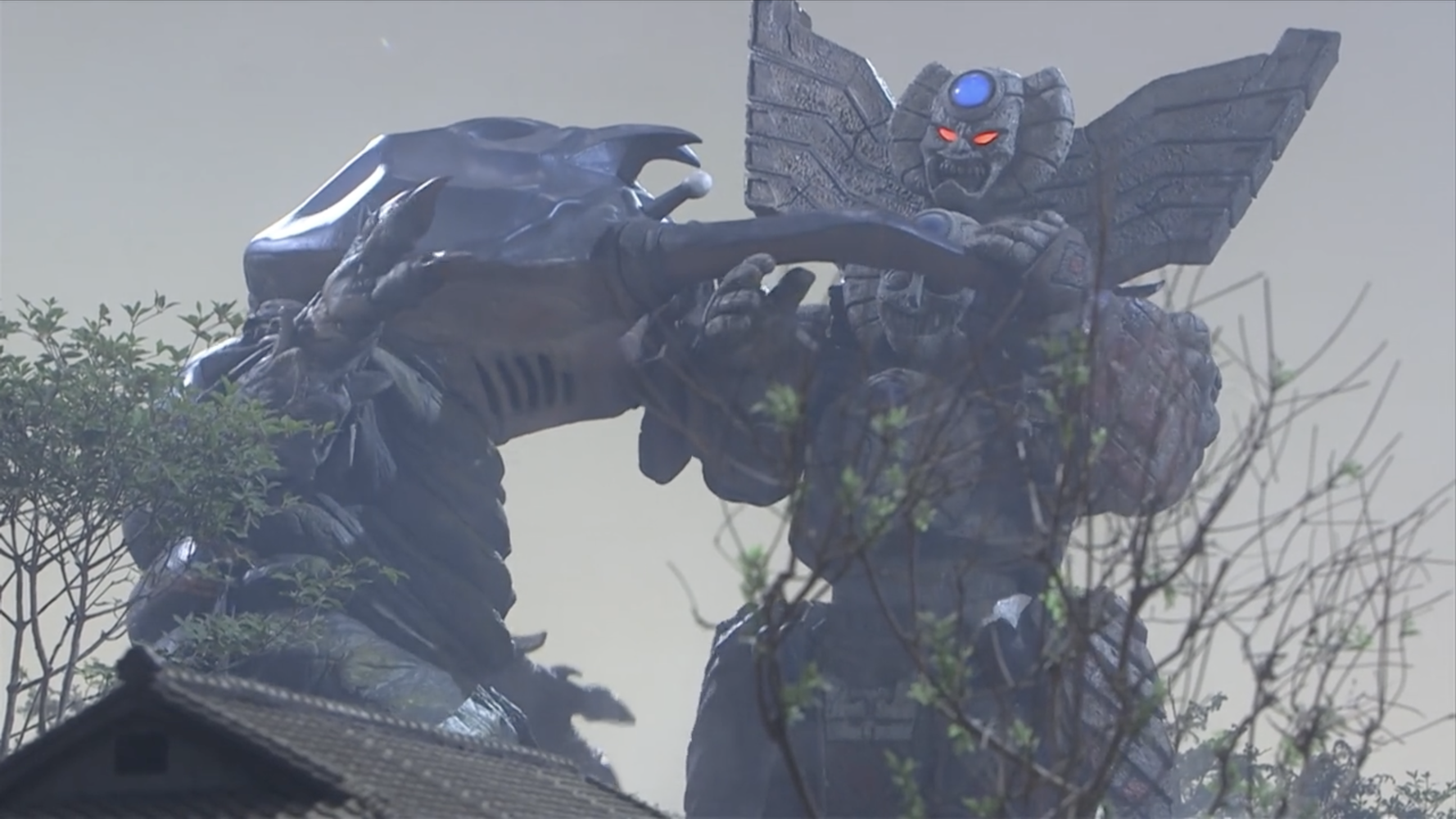 Jasyuline is a pleasingly unexpected pick for a recycled suit. Jasyuline is a deep-cut kaiju, culled from the Ultraman Mebius episode “Father Returns.” The kaiju looks like a stone totem with three faces, which makes sense for letting three characters combine inside it as one fighter. They then stumble around clumsily trying to control it, a comic bit that works thanks to Jasyuline’s humorous appearance. (The comedy from Antlar’s magnetizing power is much less successful and goes on far too long.)