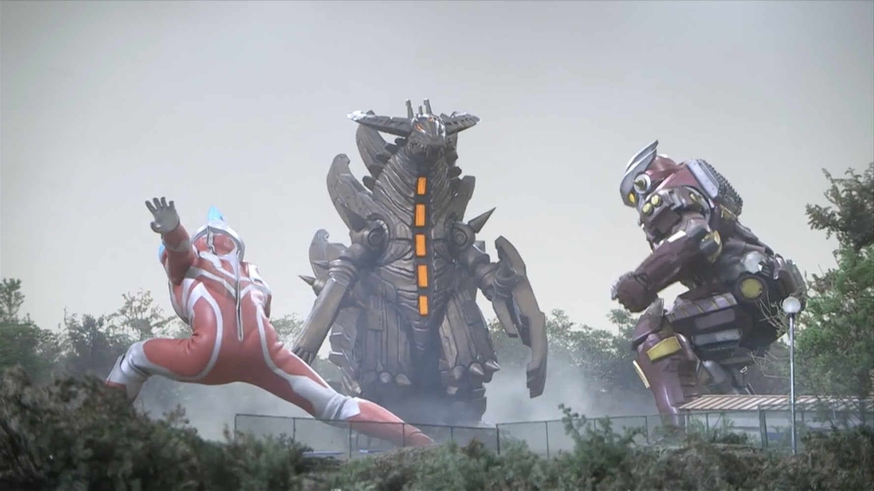 And Misuzu got transmogrified into a cool monster! And it’s not a reused suit! The kaiju Grand King first appeared in Ultraman Story in 1984, but Super Grand King is a new design and suit build — and it’s a winner. Not only does this mechanical monstrosity look fantastic and fierce, it also fights impressively with huge metal hands when it battles Ging, Jean-Nine, and the episode’s special Ultra warrior guest stars. It’s the best kaiju fight yet to happen in this boring field with its blank cream-colored sky. The cutting between the smackdown with Super Grand King and the internal battle for Misuzu’s mind keeps events rolling.