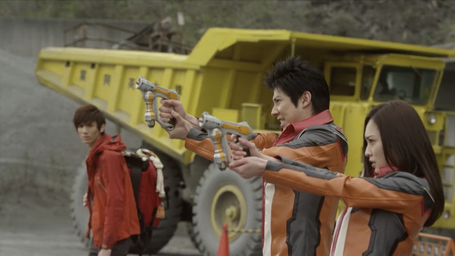 First, there’s the UPG and positioning Hikaru to join their ranks. The UPG is the most understaffed defense team in history. It comprises the tea-sipping, relaxed Captain Yoshiaki Jinno (Ryuichi Ohura); members Arisa Sugita (Yukari Taki) and Gouki Matsumoto (Takahiro Katou), who are ready to blast their laser guns at anything; and Tomoya Ichijouji (Takuya Kusakawa, the only other returning cast member from Ginga) handling the science stuff.