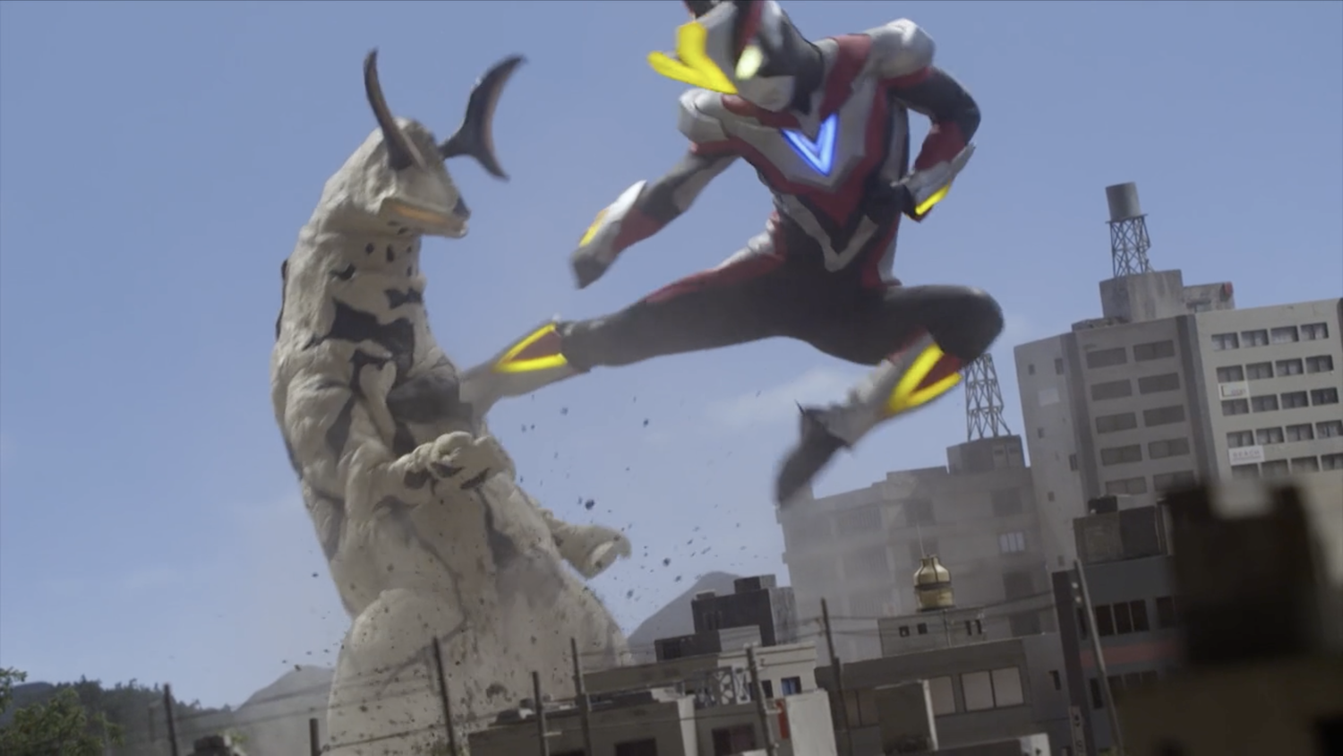 The second episode of Ultraman Ginga S doesn’t make viewers wait long for the title bout. Starting immediately where the last episode abruptly concluded, Ultraman Ginga and Ultraman Victory have their first clash, a battle against the sunset that echoes Akio Jissoji’s favorite compositions. Victory strikes first, reacting when Hikaru asks the basic question: “Uhm, what’s going on here?”